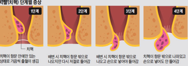 치핵은 보통 4단계로 나눌 수 있습니다. 하나씩 증상과 예를 들어드리겠습니다.