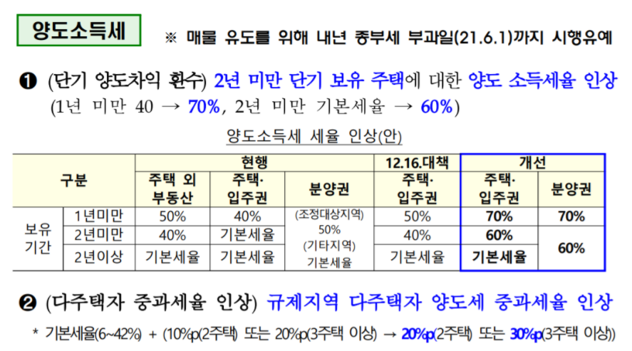 하지만 양도소득세율 같은 경우 21년 6월말까지 유예기간을 두어, 21년 6월 이전에 판매하게 된다면 기존의 세율을 인정해주고 있습니다. 그렇기 때문에 이제 생각을 잘하여 기존의 분양권을 매매한다던지 계획을 잘 세우는게 좋을 것 같습니다.