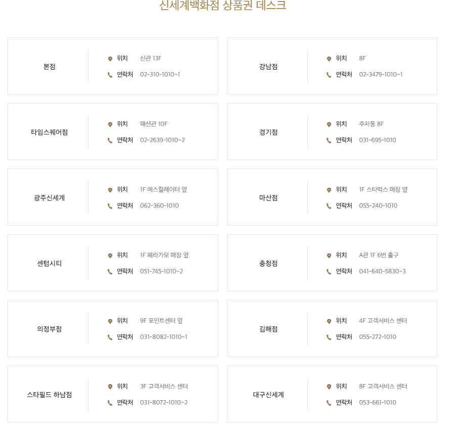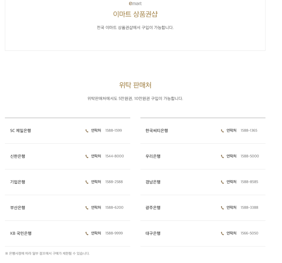 위에 상품권 데스크와 위탁판매장소들을 올려두었습니다. 이곳에서도 구입이 가능하니 꼭 백화점을 방문안하셔도 되고, 가까움 은행이나 구입처에 방문하시면 손쉽게 구입이 가능합니다.