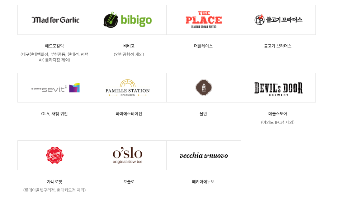 또한 스타벅스나 피자헛 등 여러 프랜차이즈 매장과 아웃백 매드포갈릭 등 프랜차이즈 레스토랑에서도 사용이 가능하고, 다른 매장들에서도 사용이 가능합니다.