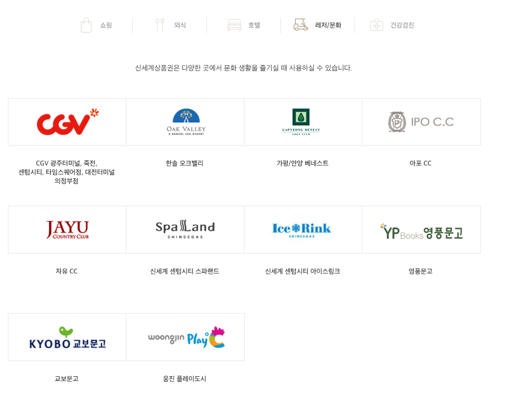 또한 레저 및 문화생활에서도 쓸수 있는데요, cgv와 한솔 오크벨리, 베네스트, 영품문고, 교보문고 등도 사용을 할 수 있습니다.