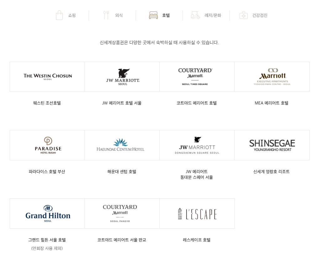 또한 신세계상푼권으로 호텔에서도 사용이 가능한데요. 웨스턴 호텔, 메리어트 호텔, 파라다이스 호텔, 센텀 호텔, 힐튼 호텔, 레스케이프 호텔 등 유명한 호텔들도 이용이 가능하기 때문에 알고 계시면 좋습니다..