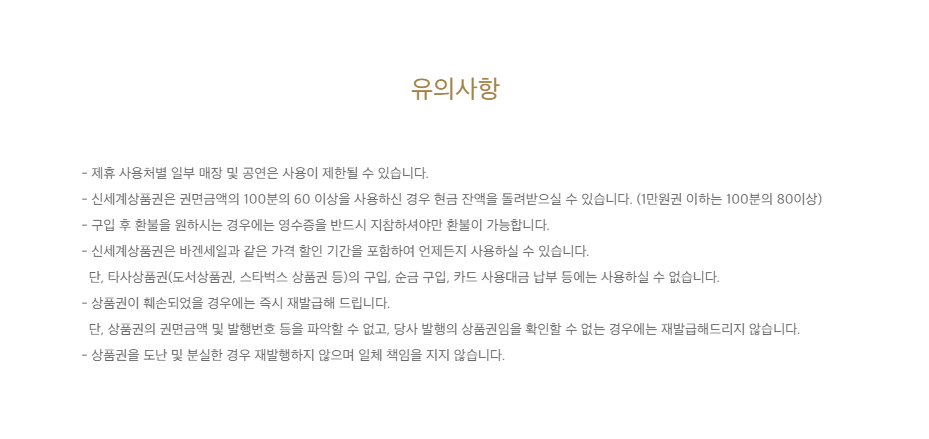 마지막으로 신세계상품권 사용에 대한 유의사항을 알려드리겠습니다. 가장 중요한 것은 신세계 상품권은 상품권 금액의 60% 이상을 사용하실 경우 현금으로 잔액을 돌려받을 수 있습니다. 그리고 환불 시 영수증을 꼭 지참하셔야 환불이 가능합니다.