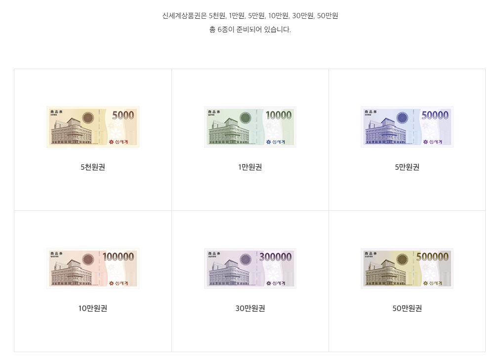 신세계 상품권은 5천원부터 50만원권까지 6가지 종류로 준비가 되어 있습니다. 보통 5만원권이나 10만원권을 많이 선물하거나 많이 받고해서 잘 알았지만 30만원권과 50만원권은 실제로 본적이 없네요.