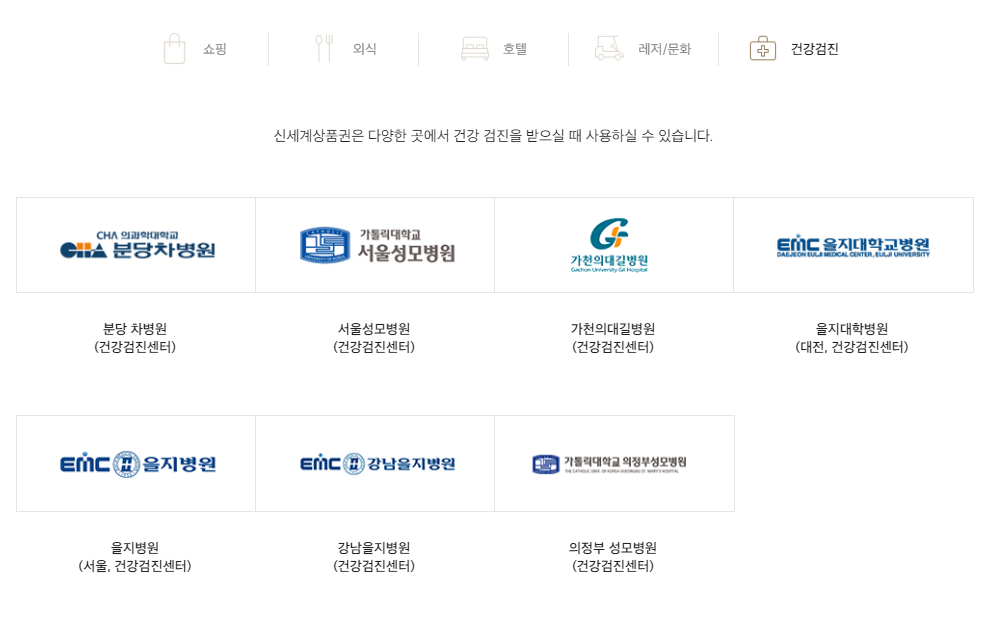 또한 신세계 상품권으로 건강검진도 받을 수 있습니다. 유명한 병원들도 다 신세계 상품권으로 건강검진이 가능합니다. 차병원, 성모병원, 길병원, 을지대병원, 의정무성모병원에서도 가능합닏나.