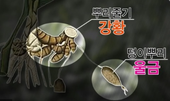 강황은 뿌리와 줄기를 말하는 것이고, 울금은 덩이 뿌리를 말하는 것입니다.